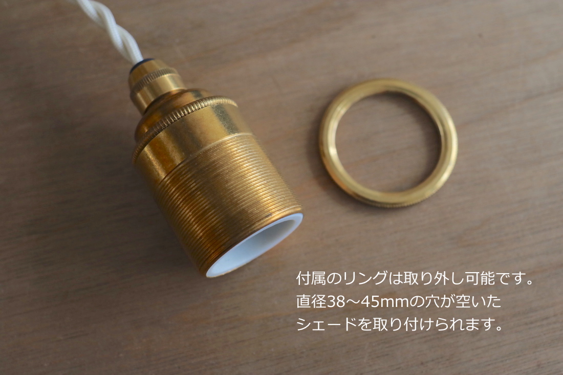 イギリス式のペンダント照明 口金E-26タイプです これまで口金E-17タイプしかラインナップがありませんでしたが、 E-26の電球が使えるソケットが登場です。 付属のリングはくるくる回して外すことができ、直径38から45mmまでの穴が空いたシェード類ををつけて使用することもできます。 また、リングは追加することもできます。挟み込んでシェードを固定したい場合には、備考欄に「リング追加希望」とご記入ください。(真鍮色+430円(税込)、GB色+570円(税込)) 電球は別売となります。(LED球も可) ![]() 上記のコードカラーからお選び頂けます。標準長さは60cmですが、コードカットや延長もできます。(10cm延長につき+80円) ※イギリス式ソケットにつきましては、その他のソケットで対応可能な特色カラー(青、赤、緑、濃茶)はお選び頂けませんので予めご了承ください。 ![]() ※お届け商品は電源部分が引掛けシーリング(通常・白)になっています。無料で黒に変更することも可能です。 ![]() ※有料となりますが、配線ダクトレール専用プラグに変更することも可能です。別付けの変換プラグが不要となり、すっきり見せられます。レールのみで使用が可能です。 プラグサイズ:幅約4×奥行約3×高さ約5cm(レール設置時に見えている高さは約4cm) ![]() コード長さを微調整したい時に便利なコードアジャスターも別売りでございます。 商品説明 サイズ:ソケット 幅 4.8cm、高さ 7cm コードの長さ(標準) 約60cm 灯具全長 約69cm 素材・色:真鍮(経年変化します)・ゴールド 状態:新品 対応W数:口金E-26。60Wまで。LED電球可。 その他:<PSE> JET認定品でLED電球や電球型蛍光灯にも対応しております。 備考: PSE適合品 コード長さをご指定いただいた場合、ご注文時の金額は標準価格のままとなっておりますので、折り返しメールにて正しい金額に修正してお知らせ致します。 注意事項:電球は別売りとなります。 市販の E26ソケット用の電球がお使いいただけます。 LED球もご使用いただけます。 取り付け部分は引っかけシーリングタイプです。 品質に関する注意事項 手作業での製作のため、コード長さは5mm〜1cm程度の誤差が出る場合がございます。 ランプの加工・製作に、通常1週間程度かかります。ご希望個数が多い場合には、余裕を持ってご注文頂けますよう、お願い致します。 ご注文を受けてから製作しますので、商品代引きはご利用いただけません。 また、銀行振込をご指定の場合、ご入金確認後の加工・製作となりますので、ご了承ください。 お急ぎのかたは、別途お問い合わせください。 日曜日、祝日の発送業務は行っておりません。 北海道、沖縄など、日数がかかる地域もございます。何卒、ご了承ください。 |