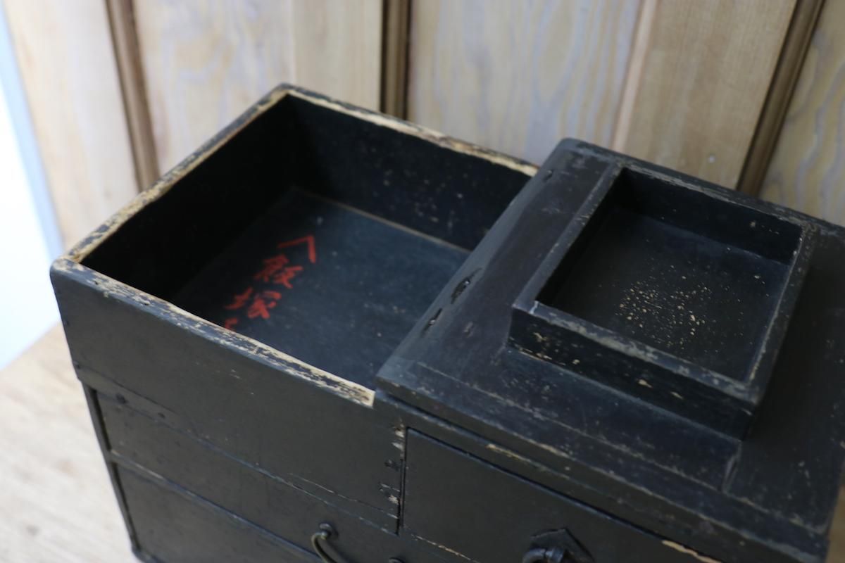 一番上はフタをパタンと開けて、そのまま裁縫ができるように作られています。中に書き込まれた文字も、まさに日本の骨董品といった雰囲気で趣きを感じます。黒い塗装がシックな佇まいなので、アンティークな空間だけでなく意外と現代の空間に置いてもかっこいいです。