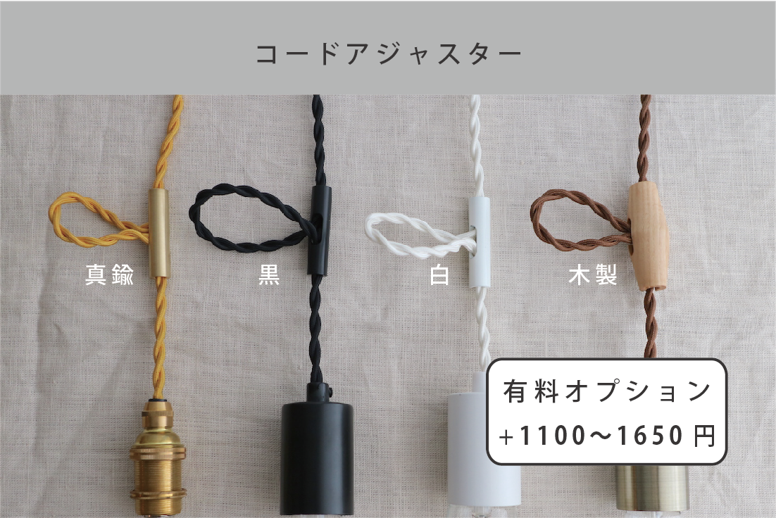 人気のコード組み合わせは、茶、ベージュ、アンティークホワイトです。 ![]() ビンテージスタイルのソケットランプです。 口金E-26のエジソン電球やLED電球と合わせてご使用いただけます。(電球は別売です) ![]() ![]() 真鍮製ソケットの上に光沢のあるゴールドメッキが施されています。 人気のコード組み合わせは、茶、ベージュ、アンティークホワイトです。 シンプルでどんなテイストの空間にも合わせやすく、店舗にもおすすめです。 ソケットは他にも各色ございます。 ![]() カラーをミックスしてディスプレイしても面白いです。 ![]() 標準色は上記のコードカラーからお選び頂けます。標準長さは60cmですが、コードカットや延長もできます。(10cm延長につき+80円) ![]() 珍しい特色カラー:赤、青、緑、濃茶(10cm/100円)もございます。(特色カラーは在庫に限りがございます) ![]() ※お届け商品は電源部分が引掛けシーリング(通常・白)になっています。無料で黒に変更することも可能です。 ![]() ※有料となりますが、配線ダクトレール専用プラグに変更することも可能です。別付けの変換プラグが不要となり、すっきり見せられます。レールのみで使用が可能です。 プラグサイズ:幅約4×奥行約3×高さ約5cm(レール設置時に見えている高さは約4cm) ![]() コード長さを微調整したい時に便利なコードアジャスターも別売りでございます。 ![]() コード長さの参考に。手前が標準60cm、奥が80cmになります。 天井のレール部分の高さ:約240cm カウンターの高さ:約113cm ![]() 実際にカフェで使われているこんな雰囲気で。 ![]() ![]() ![]() 基本コード長さは60cmですが、天井が高い場所には、コードを長くして使用すると空間に動きが出ていい感じです。 ![]() カフェで使われているこんな雰囲気で。 あえて、ソケットはそのまま電球のきらきらした感じが遠くからでも目立ちます。 コードを思い切って長めにしてもかっこいいです。 ![]() 商品説明 サイズ:ソケットの幅 約4cm、高さ 約8cm コードの長さ(標準) 約60cm 灯具全長 約70cm 素材・色:真鍮の上にメッキ塗装 状態:新品/アメリカ製 対応W数:60Wまで。LED電球可。電球は別売り。 備考: PSE適合品 「長さ指定」の場合は、ご注文の際に備考欄にご記載ください。 ご注文確認メールにて、金額の変更とお知らせを致します。 品質に関する注意事項 電球が口金にひっかかり底面に届かない電球がございます。 手作業での製作のため、コード長さは5mm〜1cm程度の誤差が出る場合がございます。 ご注文を受けてから製作しますので、商品代引きはご利用いただけません。 ランプの加工・製作に、通常1週間程度かかります。ご希望個数が多い場合には、余裕を持ってご注文頂けますよう、お願い致します。 また、銀行振込をご指定の場合、ご入金確認後の加工・製作となりますので、ご了承ください。 お急ぎのかたは、別途お問い合わせください。 日曜日、祝日の発送業務は行っておりません。 北海道、沖縄など、日数がかかる地域もございます。何卒、ご了承ください。 |